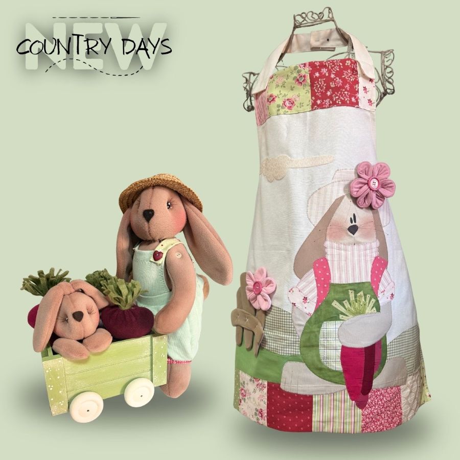 Domenica 12 aprile il grembiule CONTANIGLIO, un grembiule in tela panna, con bordi patchwork e applicazione piatta e tridimensionale.